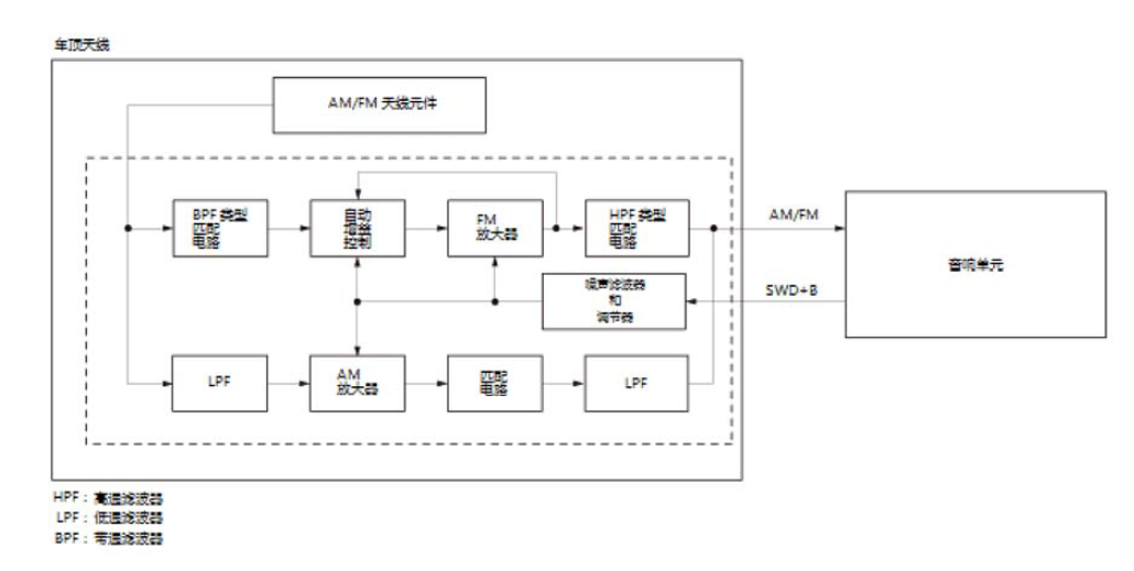 车顶天线有一个AM 和一个FM 放大器。FM 信号的灵敏度可通过自动增益控制提高。