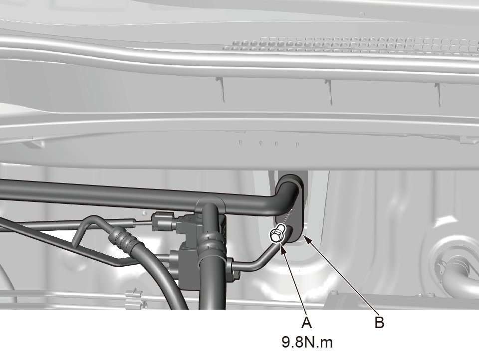 1. 用 10mm 套筒拆卸固定螺栓(A),拆卸空调管(B)。