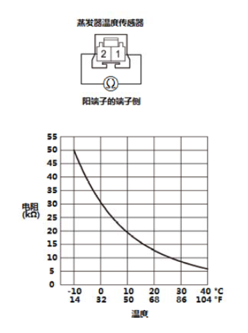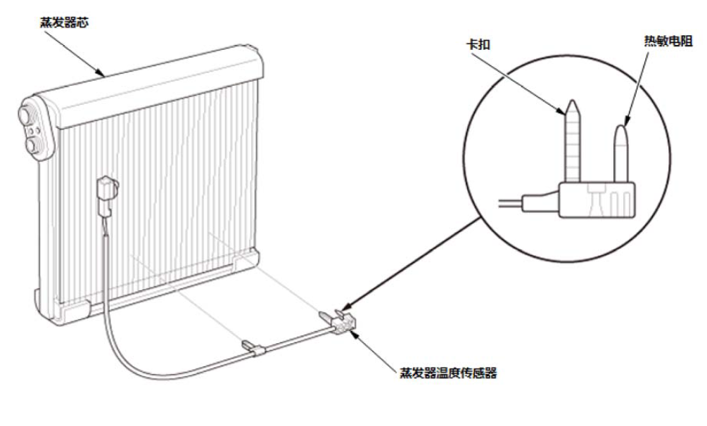 蒸发器温度传感器采用芯片式热敏电阻,其传感芯直接安装在蒸发器芯散热片上。传感器连接至空调控制单元,持续监控蒸发器芯的温度。如果温度接近水的凝固点,空调压缩机和风扇会短暂地停止运转。如果蒸发器温度过低,低温表面上凝结的湿气会冻结,使得蒸发器气流受限且空调性能不佳。