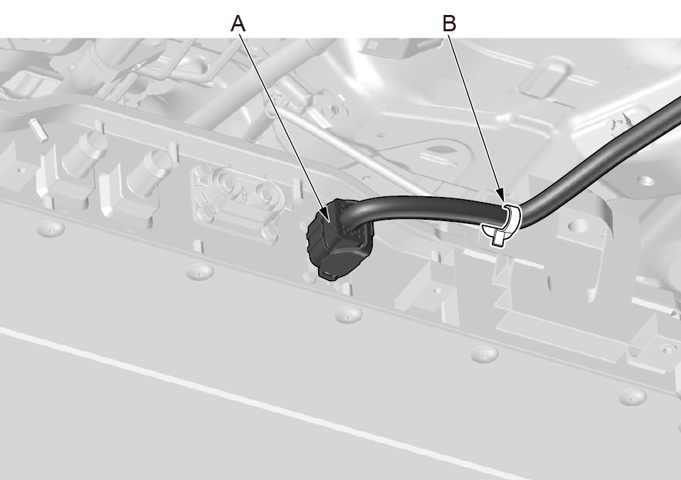 1.脱开动力电池包高压线束固定卡扣(A)。 2.脱开动力电池包高压线束插接器(B)。 |