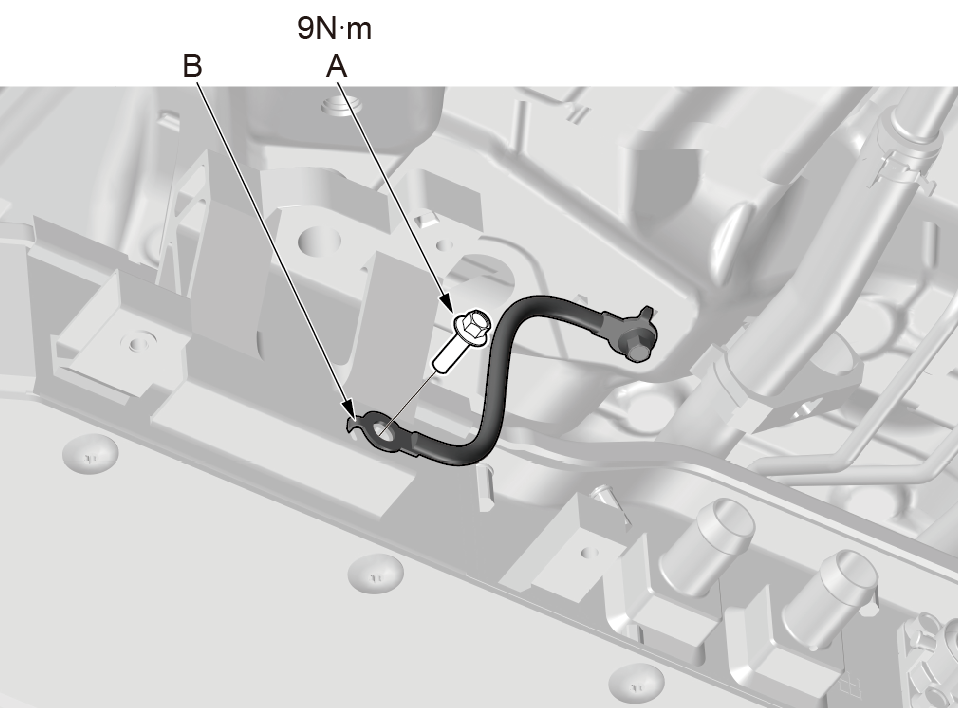 1.安装动力电池包搭铁线(B)。 2.使用扭力扳手安装动力电池包搭铁线固定螺栓(A)。 |