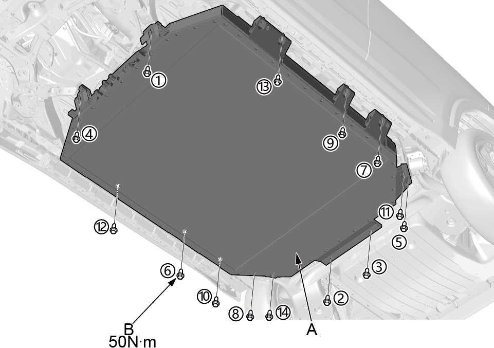 2.对准安装孔缓慢升起举升平台车,确保动力电池包安装孔位平面与车身安装孔位平面平行,调整举升平台车位置直至所有安装孔对准。 3.更换新的固定螺栓(B),用14mm扭矩扳手按图示数字顺序安装螺栓,将动力电池包(A)的14个固定螺栓(B)紧固至 50 N·m。使用预置型扭矩扳时,务必慢慢紧固并且不要过度紧固。在紧固时,如果螺栓发出任何声音,则松开螺栓并从第一步重新紧固螺栓。 4.降下举升平台车。