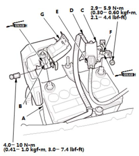 4.在端子上涂抹多用途润滑脂以防腐蚀。 5.关闭盖(G)。 |