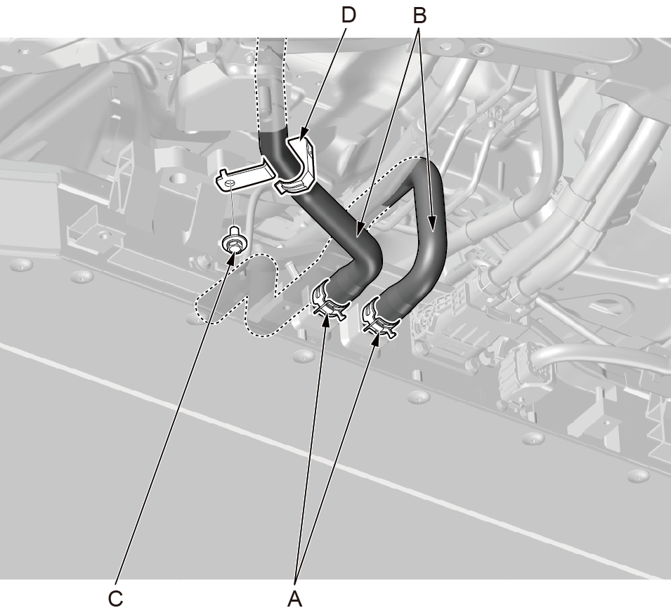 1.安装动力电池包进出水管(B)。 2.用水管卡箍拆装钳安装动力电池包进出水管2个固定卡箍(A)。 3.安装水管支架(D),使用8mm套筒安装进出水管支架固定螺栓(C)。 |