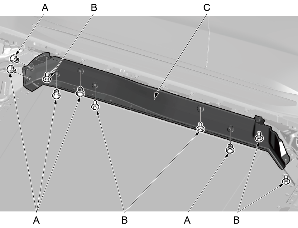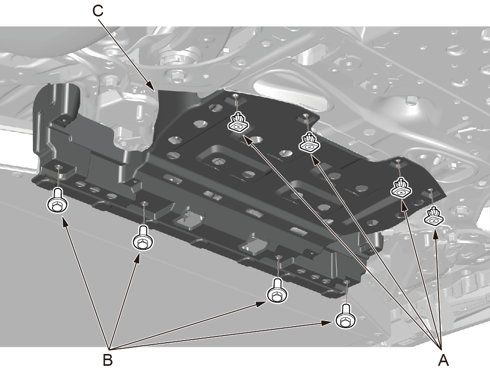 1.使用十字起拆卸动力电池包前护板固定卡夹 2.使用10mm套筒拆卸动力电池包前护板4个固 3.取下动力电池包前护板(C)。 |