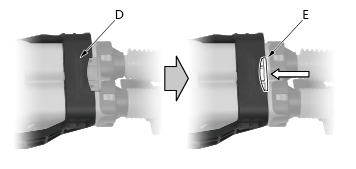 2.将手柄(D)旋转安装到位,将CPA按钮(E)推至锁止位置。 |