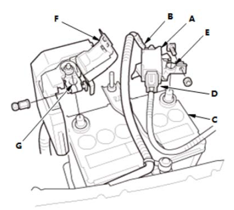 3.打开盖(F)。 4.从12 V 蓄电池上断开正极端子 (G)。
