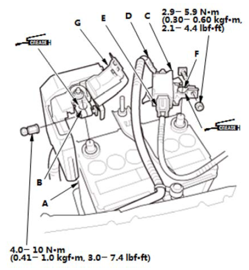 4.在端子上涂抹多用途润滑脂以防腐蚀。 5.关闭盖(G)。 |