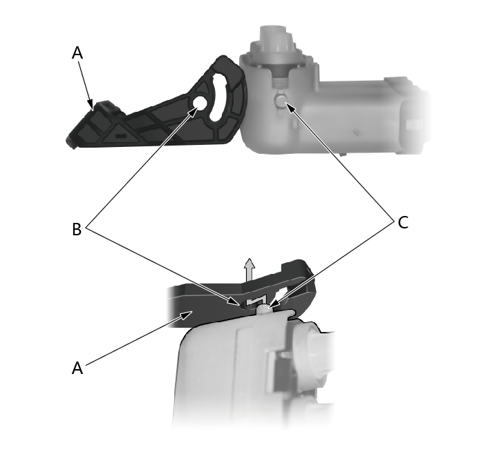 1.调整手柄(A)安装方向,先将手柄一端安装开孔(B)对准凸台(C)安装,使用相同方法安装另一端。